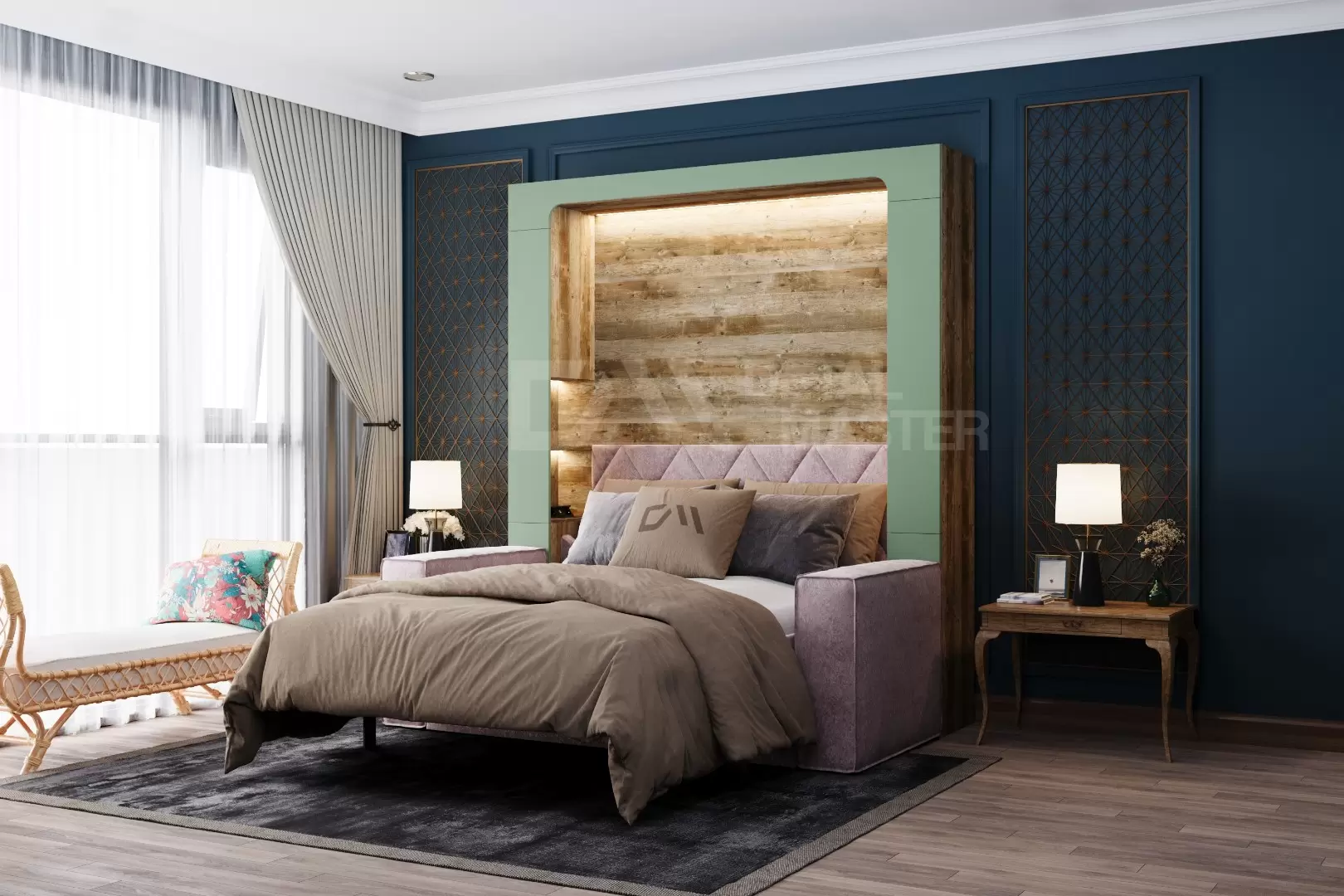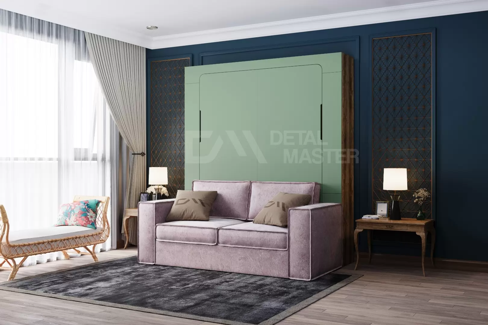 Фасад шкаф-кровати выполнен из МДФ супер матовый Фисташка, со сглаженными краями. Что позволит обезопасить вас от ударов при ходьбе возле кровати в разложенном положении и добавит изысканность модели шкаф-кровати. Корпус выполнен из ЛДСП декор Кейптаун. По бокам модель оснащена полками для хранения вещей с закрывающимися дверцами.